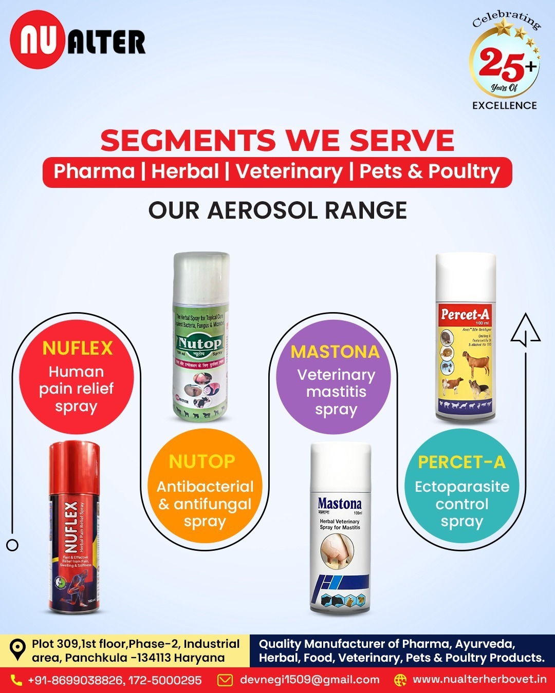 Altar Group Cos. offers a wide range of aerosol sprays including NUFLEX human pain relief spray, NUTOP antibacterial & antifungal spray, MASTONA veterinary mastitis spray and PERCET-A ectoparasite control spray. WHO-GMP compliant third-party manufacturer serving pharma, herbal, veterinary, pets and poultry segments with quality and trusted formulations.