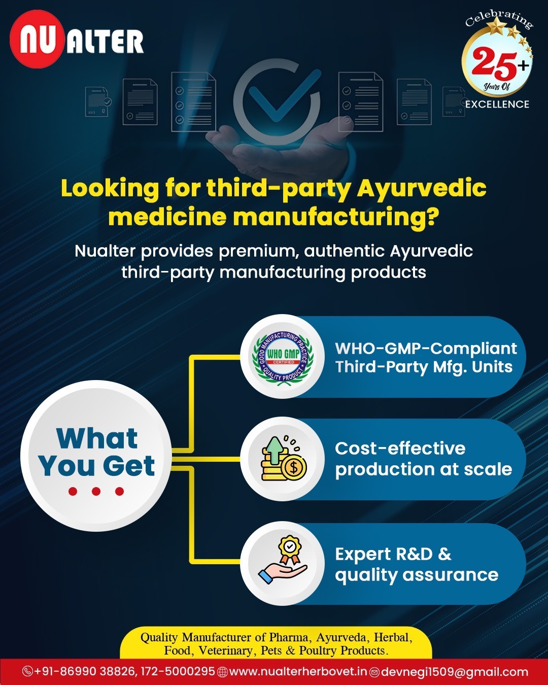 Nu Alter offers premium third-party Ayurvedic medicine manufacturing with WHO-GMP compliant units. Cost-effective production, expert R& D, and assured quality for Ayurvedic, herbal & pharma products.